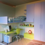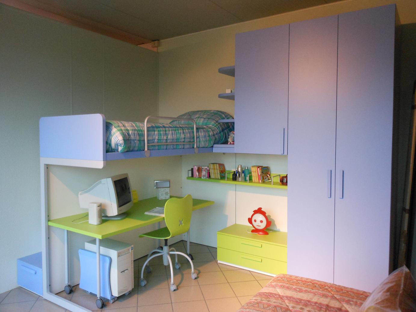 Cameretta con letto sopraelevato e sotto scrivania. In colore azzurro verde....