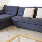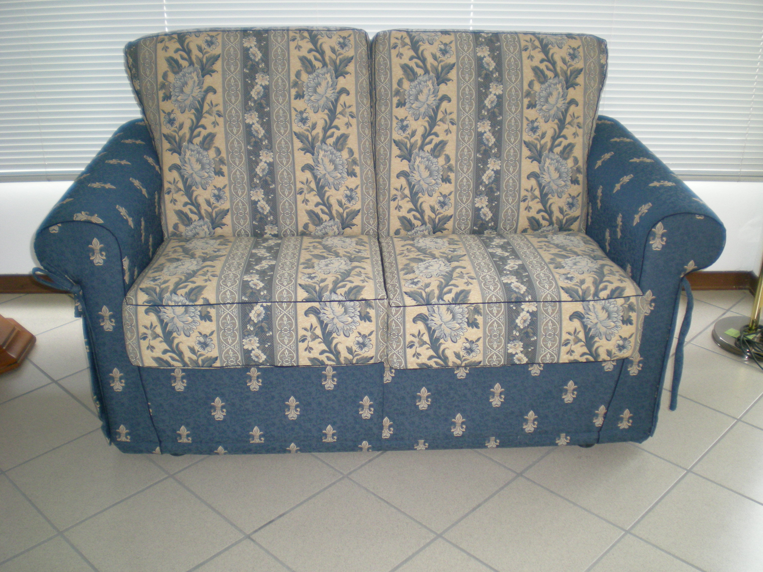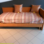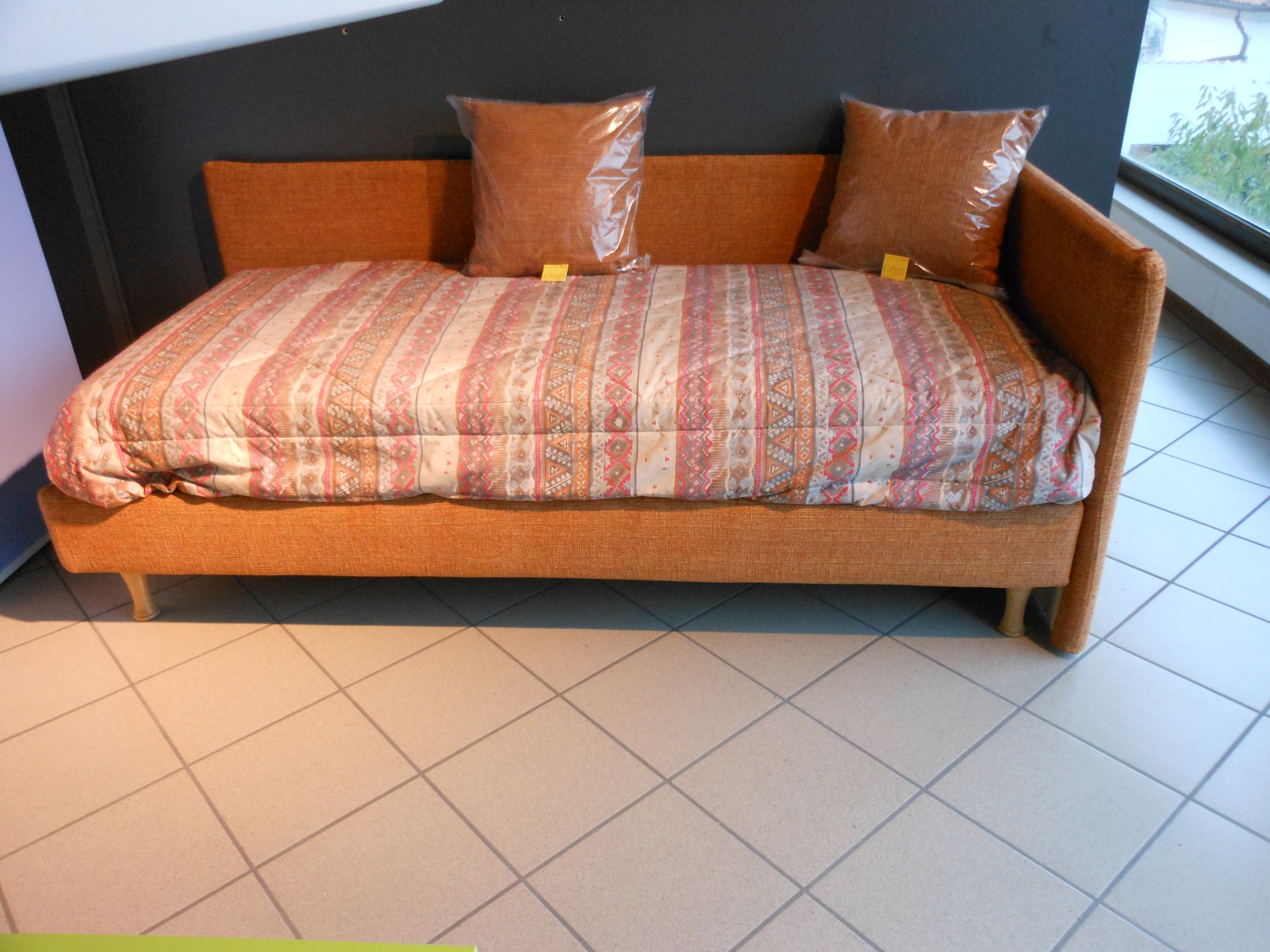 Letto imbottito colore arancio con piedi in legno. Completo di rete e n. 2...